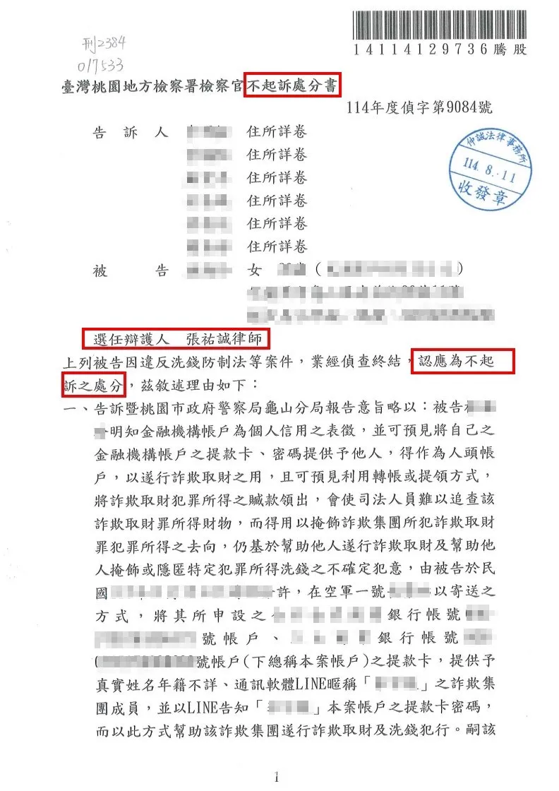 經過張祐誠 律師詳盡的辯護與證據梳理,檢察官審酌後認為,現今詐騙手法層出不窮,一般人極易因高額獎金誘惑而陷於錯誤。加上當事人確實有匯款給詐騙集團且事後主動報案的事實,難以認定她有幫助詐欺或洗錢的犯意。